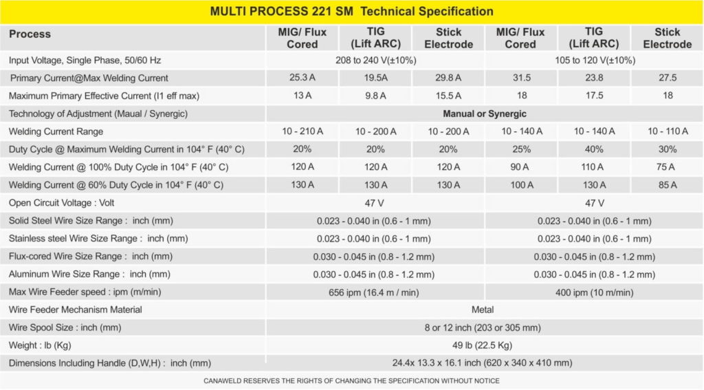 The Multiprocess 221 SM is a powerful, portable, and very intelligent welding machine. This unit is capable of MIG welding, stick welding and TIG welding with a lift start in manual or synergic mode. The combination of synergic control and job programming ability makes this unit user-friendly for less experienced welders looking to perform high quality welds. It features a user-friendly panel which walks the user through setup one step at a time and then automatically adjusts its parameters to meet the required use. It’s like having your own personal welding expert right there with you! The voltage of this unit is selectable between 230 V (±15%) or 115 V (±15%) which makes it suitable for any single voltage electrical network. It is the perfect choice for anyone; from a novice to the professional production welder who has speed and quality in mind. The Multiprocess 221 SM is capable of welding with Canaweld’s spool gun which ensures trouble-free Aluminum MIG welding too.
