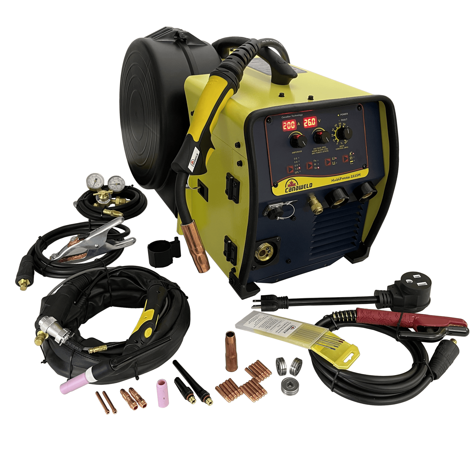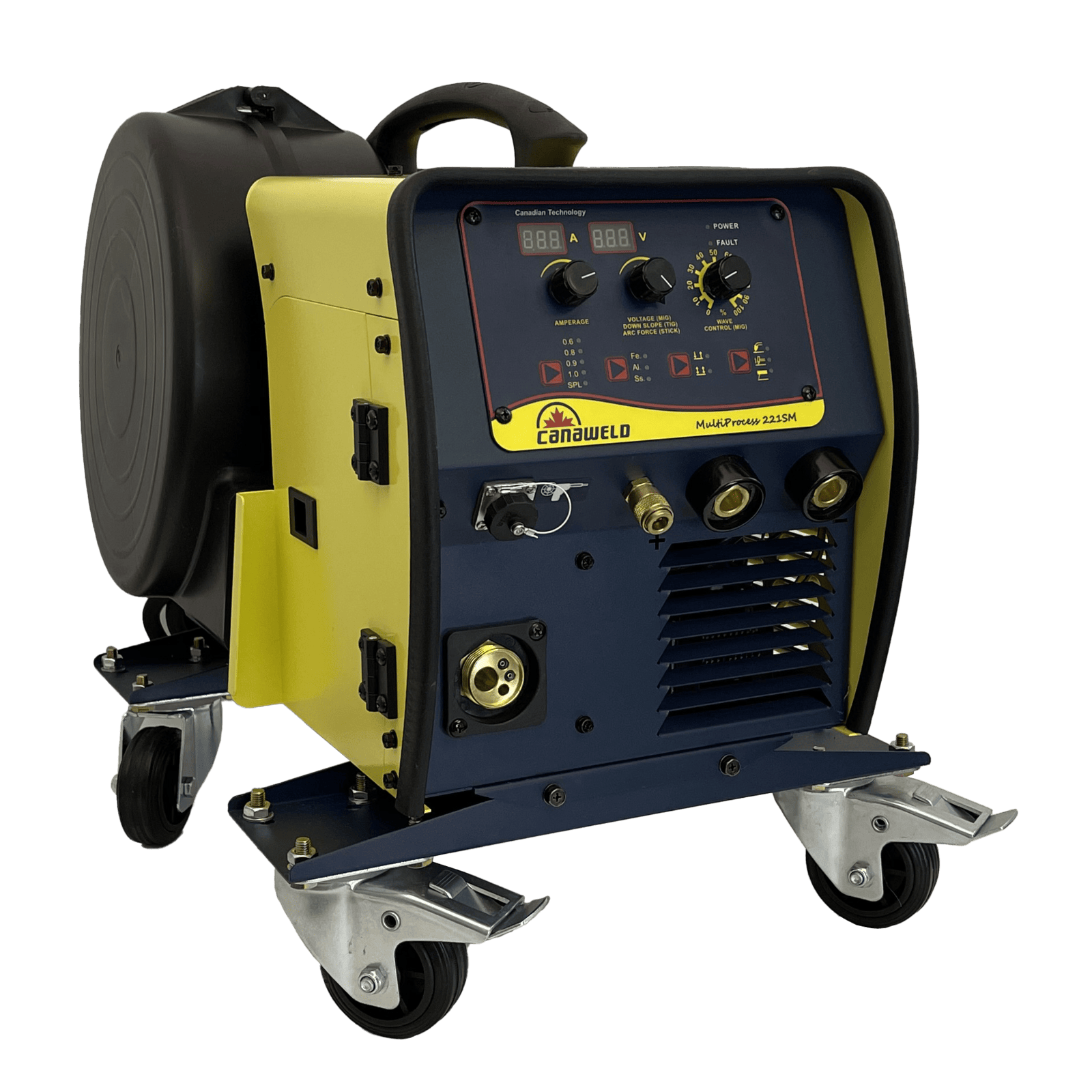 The Multiprocess 221 SM is a powerful, portable, and very intelligent welding machine. This unit is capable of MIG welding, stick welding and TIG welding with a lift start in manual or synergic mode. The combination of synergic control and job programming ability makes this unit user-friendly for less experienced welders looking to perform high quality welds. It features a user-friendly panel which walks the user through setup one step at a time and then automatically adjusts its parameters to meet the required use. It’s like having your own personal welding expert right there with you! The voltage of this unit is selectable between 230 V (±15%) or 115 V (±15%) which makes it suitable for any single voltage electrical network. It is the perfect choice for anyone; from a novice to the professional production welder who has speed and quality in mind. The Multiprocess 221 SM is capable of welding with Canaweld’s spool gun which ensures trouble-free Aluminum MIG welding too.