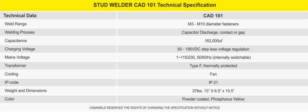 The Canaweld CAD 101 stud welding system offers a full 3/8” (M10) welding capacity and has the industry’s best capacitance-to-weight ratio. Because of the CAD 101’s compact design, it is suitable for benchtop or automated applications with the Canaweld auto feed welding head, and can be used with any of Canaweld’s hand guns. The CAD 101 is equipped with a microcontroller which will keep this model continually up to date. It is equipped with a 15-pin subminiature interface allowing for remote triggering, ready signals, and reload circuitry among others for automation. The CAD 101 is sold as a stand-alone power supply or as a complete welding system including gun, two ground cables, and collets and changing tools.