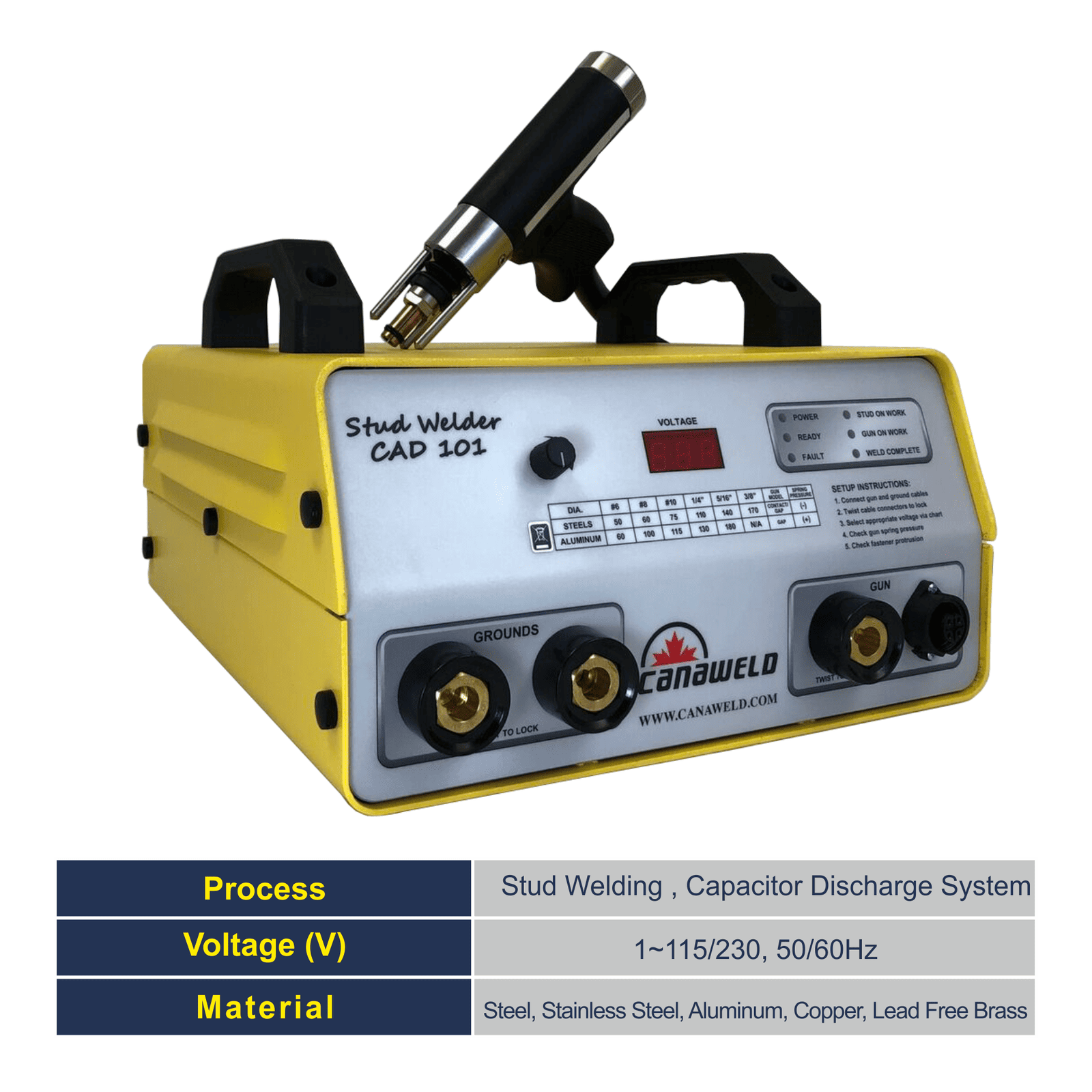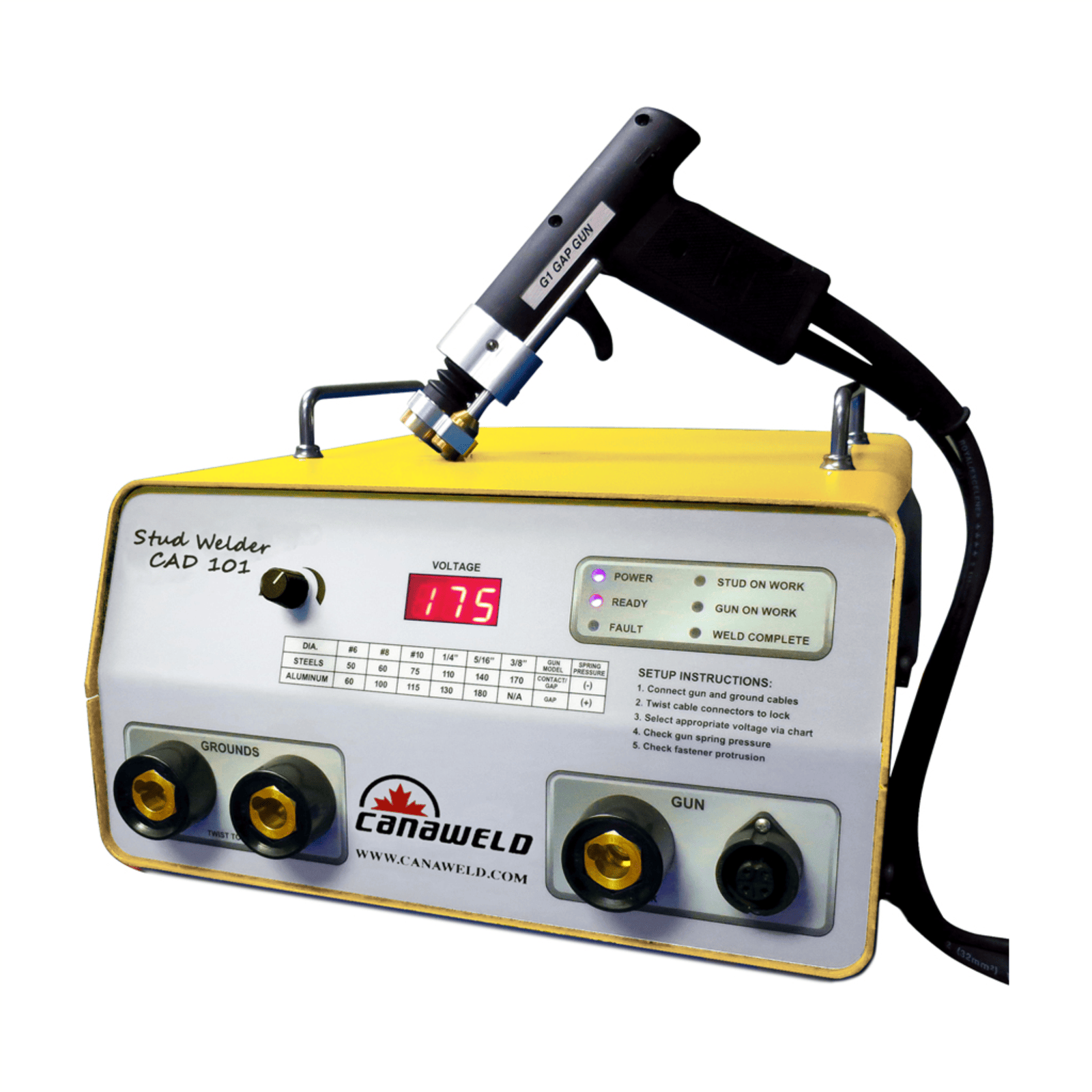 The Canaweld CAD 101 stud welding system offers a full 3/8” (M10) welding capacity and has the industry’s best capacitance-to-weight ratio. Because of the CAD 101’s compact design, it is suitable for benchtop or automated applications with the Canaweld auto feed welding head, and can be used with any of Canaweld’s hand guns. The CAD 101 is equipped with a microcontroller which will keep this model continually up to date. It is equipped with a 15-pin subminiature interface allowing for remote triggering, ready signals, and reload circuitry among others for automation. The CAD 101 is sold as a stand-alone power supply or as a complete welding system including gun, two ground cables, and collets and changing tools.