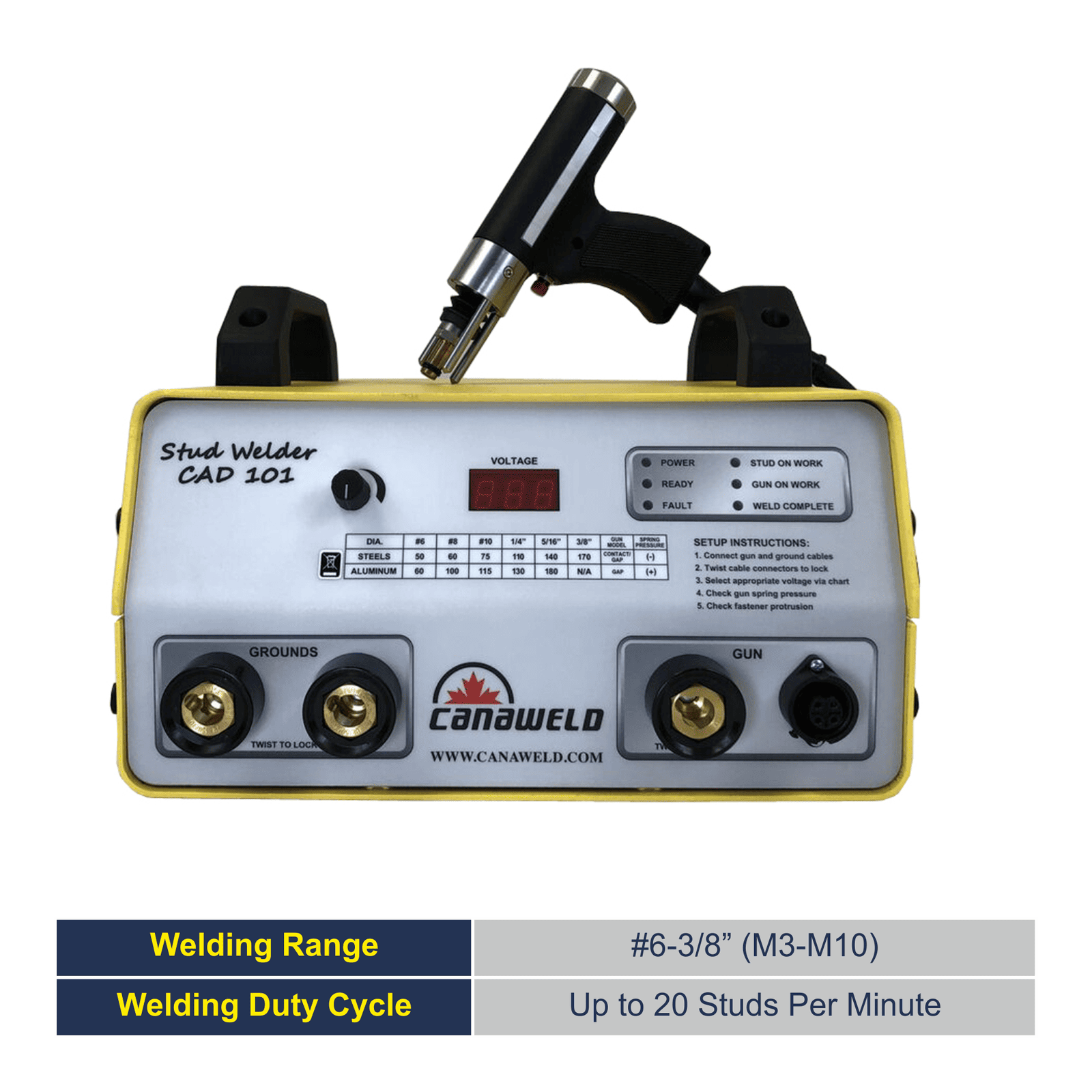 • Weld Range: US Stud Size #6 – 3/8”, Metric Stud Size (M3-M10), Stud diameter 0.125″ – 0.375″